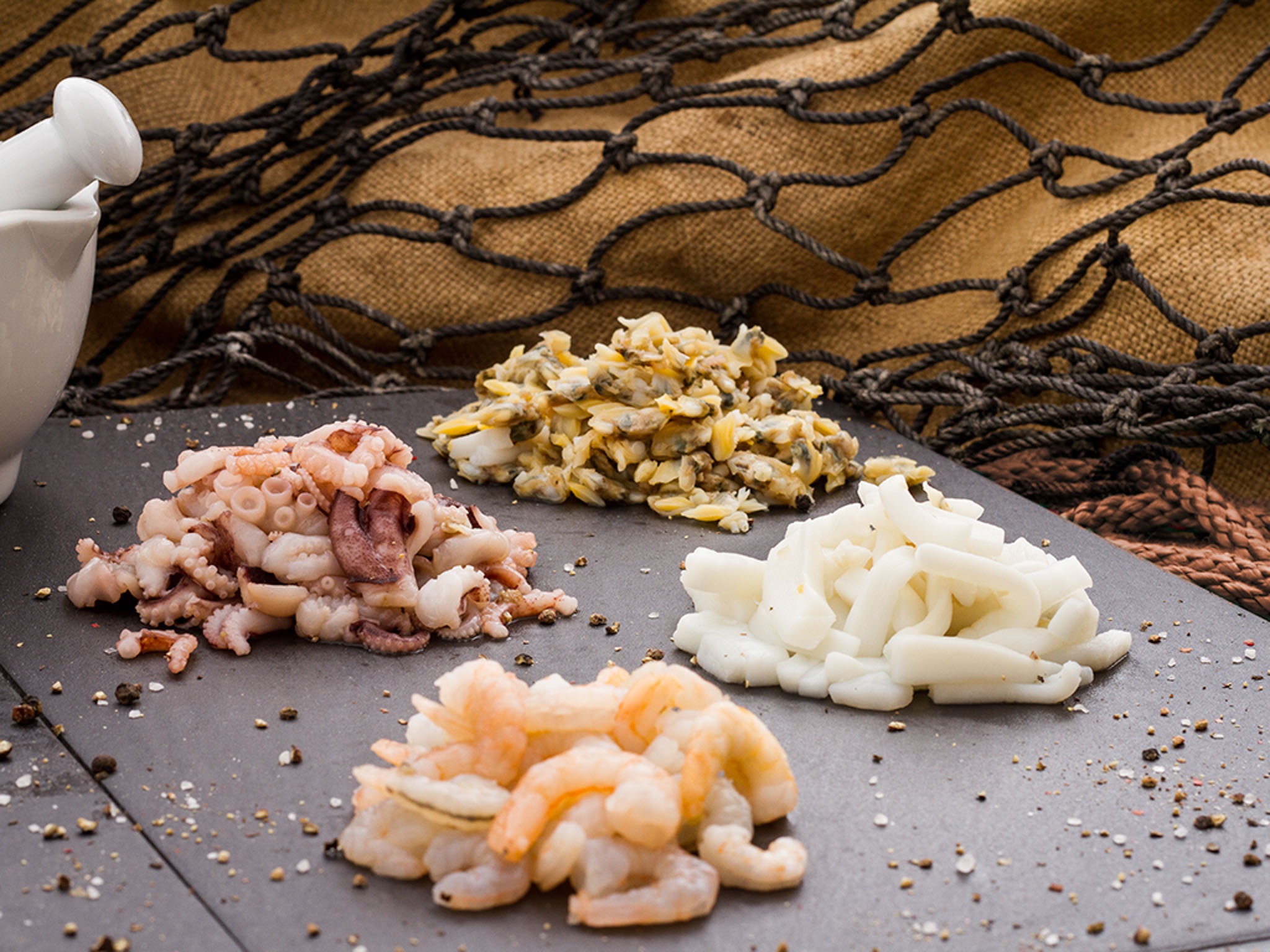 Baby-Octopus, Muschelfleisch, Tintenfischstreifen, Garnelenfleisch