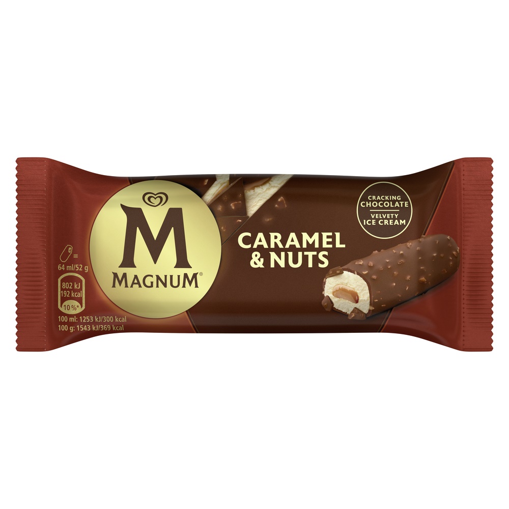 Cremiges Vanilleeis m.Kern aus zarter Caramel-Sauce in knackiger Magnum-Schokolade m.Erdnussstückch.